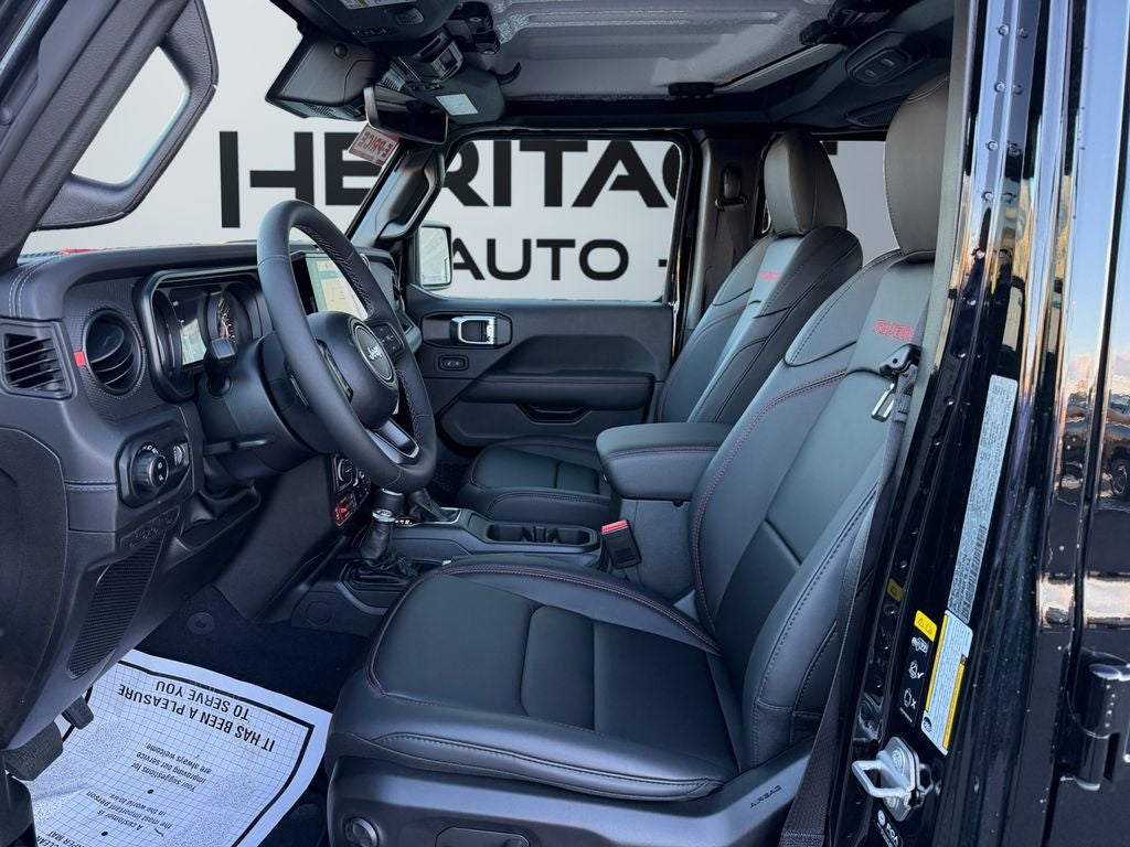 Convenience Group: SiriusXM Radio Service; Remote Start System; SiriusXM with 360L; Universal Garage Door Opener; Heated Front Seats; Heated Steering Wheel. Safety Group: Auto High Beam Headlamp Control; Blind Spot and Cross Path Detection; ParkSense Rear Park Assist System. Technology Group: Google Android Auto; SiriusXM Radio Service; 12.3" Touchscreen Display; Integrated Off-Road Camera; USB Host Flip; HD Radio; Rear View Auto Dim Mirror; Bluetooth® Wireless Speaker; Integrated Voice Command with Bluetooth®; Connectivity - US/Canada; Uconnect 5 Navigation with 12.3" Display; GPS Navigation; 4G LTE Wi-Fi Hot Spot; GPS Antenna Input; SiriusXM with 360L; Connected Travel and Traffic Services; Alexa Built-In; Apple CarPlay. Quick Order Package 24R Rubicon. Steel Bumper Group: Steel Front Bumper. Power Adjust Nappa Leather Seats. Black 3-Piece Hard Top. Black Clearcoat. MOPAR Spray in Bedliner. **Equipment listed is based on original vehicle build and subject to change. Please confirm the accuracy of the included equipment by calling the dealer prior to purchase.**